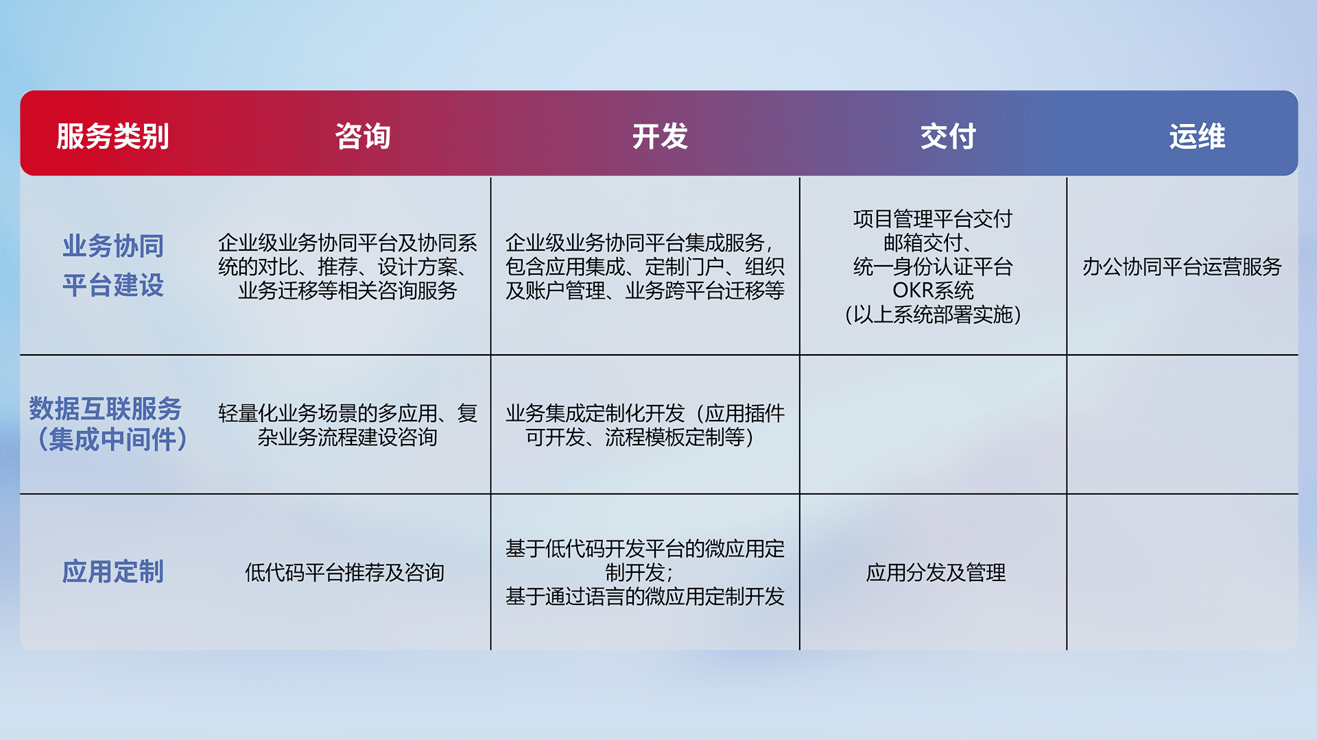 针对钉钉、、企微、、、、IDaas等平台级产品提供产品的规划、、、方案、、、、交付、、、、定制化开发等服务,,,实现如统一协同办公、、、、智能客户服务、、混合会议管理、、、智能数据查询、、等业务场景,,,实现数字化转型。。。